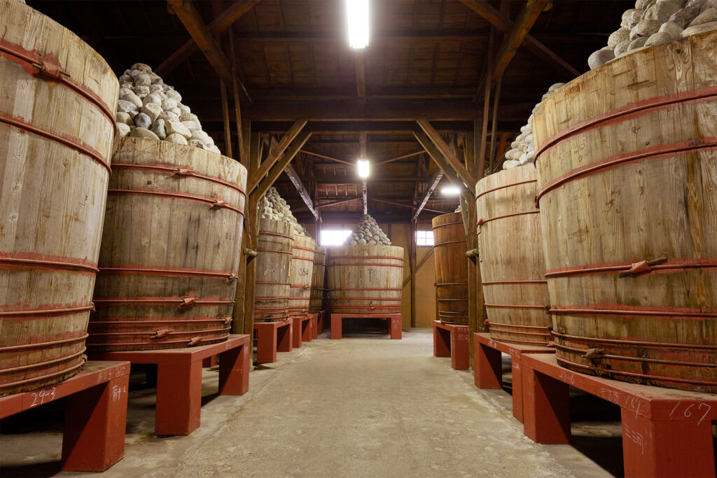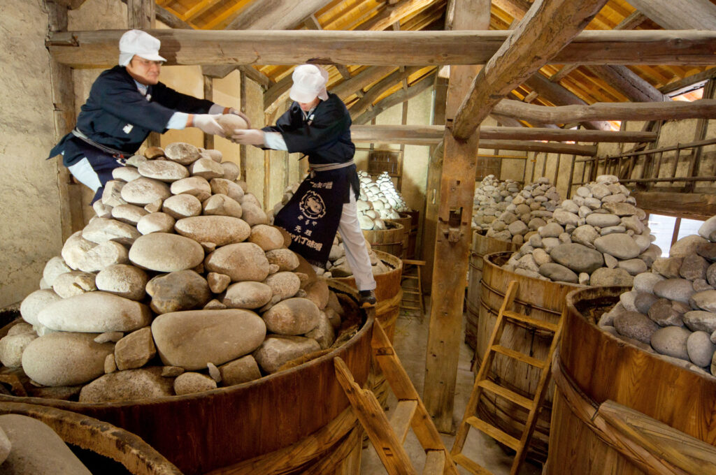 豆麹を仕込んだ木桶の上に3トンの石を積み上げ、二夏二冬の期間熟成させる。