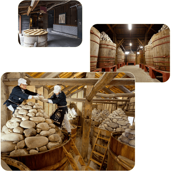 ※岡崎市のカクキュー、まるやは、伝統製法による豆みそ(赤みそ)づくりを続けている。