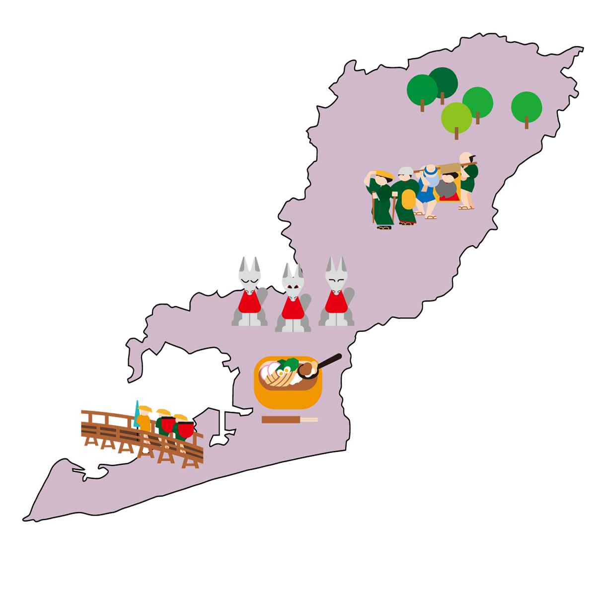 織田信長、豊臣秀吉、徳川家康がそろって、武田軍に打ち勝った長篠・設楽原の戦いにまつわる城や古戦場、家康をはじめ多くの武将にもゆかりのある吉田城、豊川稲荷、そして江戸の旅人たちも歩いた旧街道の松並木なども楽しめるエリア。