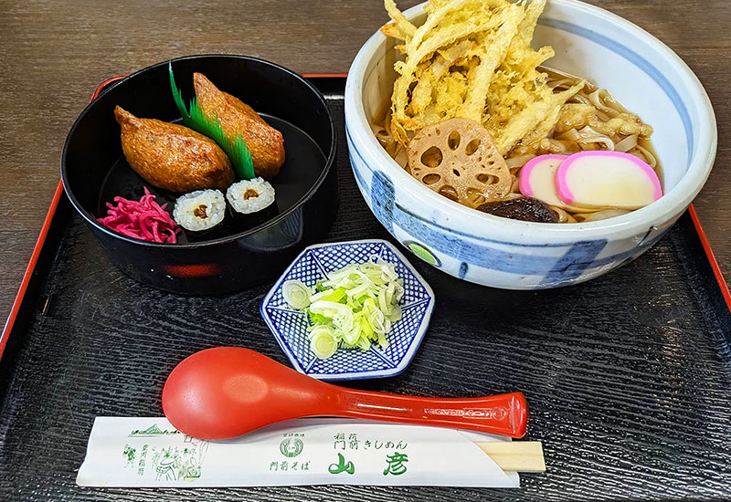 ゴボウのかき揚げ天を乗せたきしめんと山ごぼうの味噌漬けの海苔巻き、豊川稲荷寿司のセットです。
