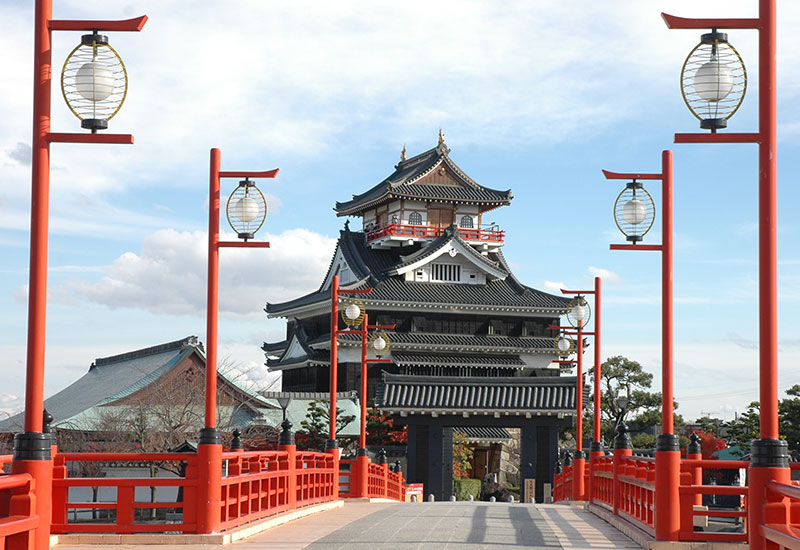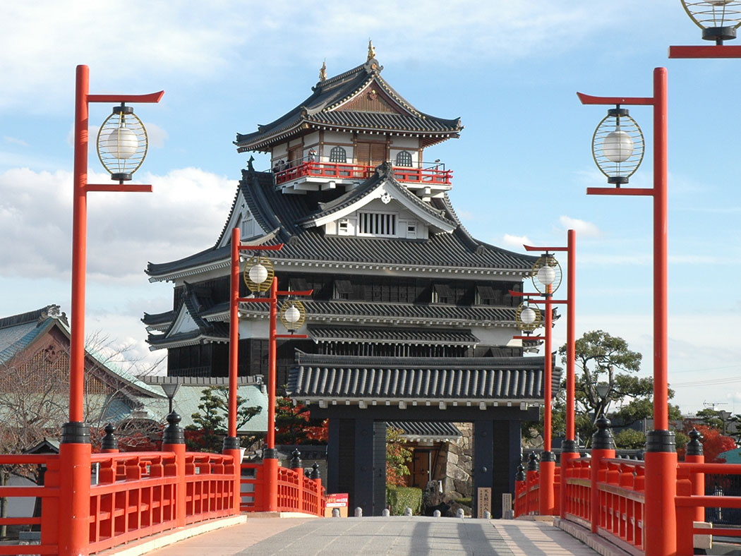 天文23年(1554)※に織田信長が入城して居城とした。信長はこの城から桶狭間に出陣した。平成に再建された模擬天守は五条川に架かる赤い橋とともに絵になる風景。