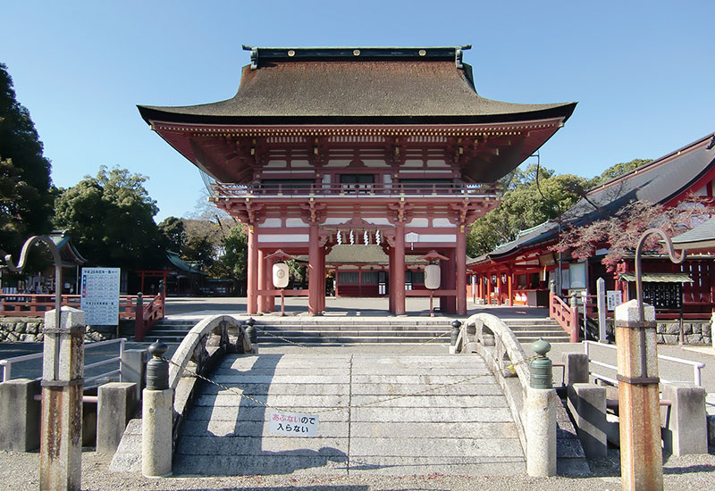 豊臣秀吉が朝鮮出兵の際に神社社叢から大杉を伐り出し、船の帆柱に使用し、航海の安全を祈願したという。本殿裏山に続く回遊式林泉式庭園は、南北朝時代の高僧・夢想国師作と伝わる。