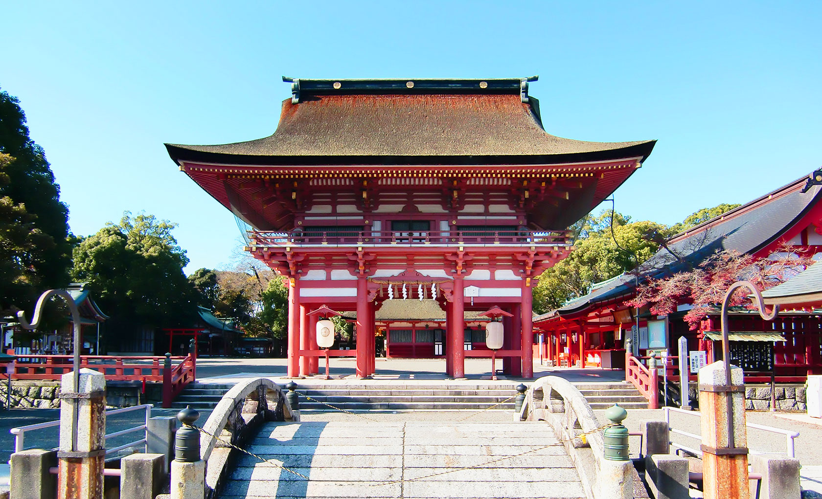 建速須佐之男命と大穴牟遅命を御祭神とし、古くは除疫、授福の神である「牛頭天王社」とも呼ばれ、京都の八坂神社と並ぶ天王社として崇められている。また、全国に3000以上も点在する津島神社の総本社でもある。「楼門」は豊臣秀吉の寄進と伝わる。